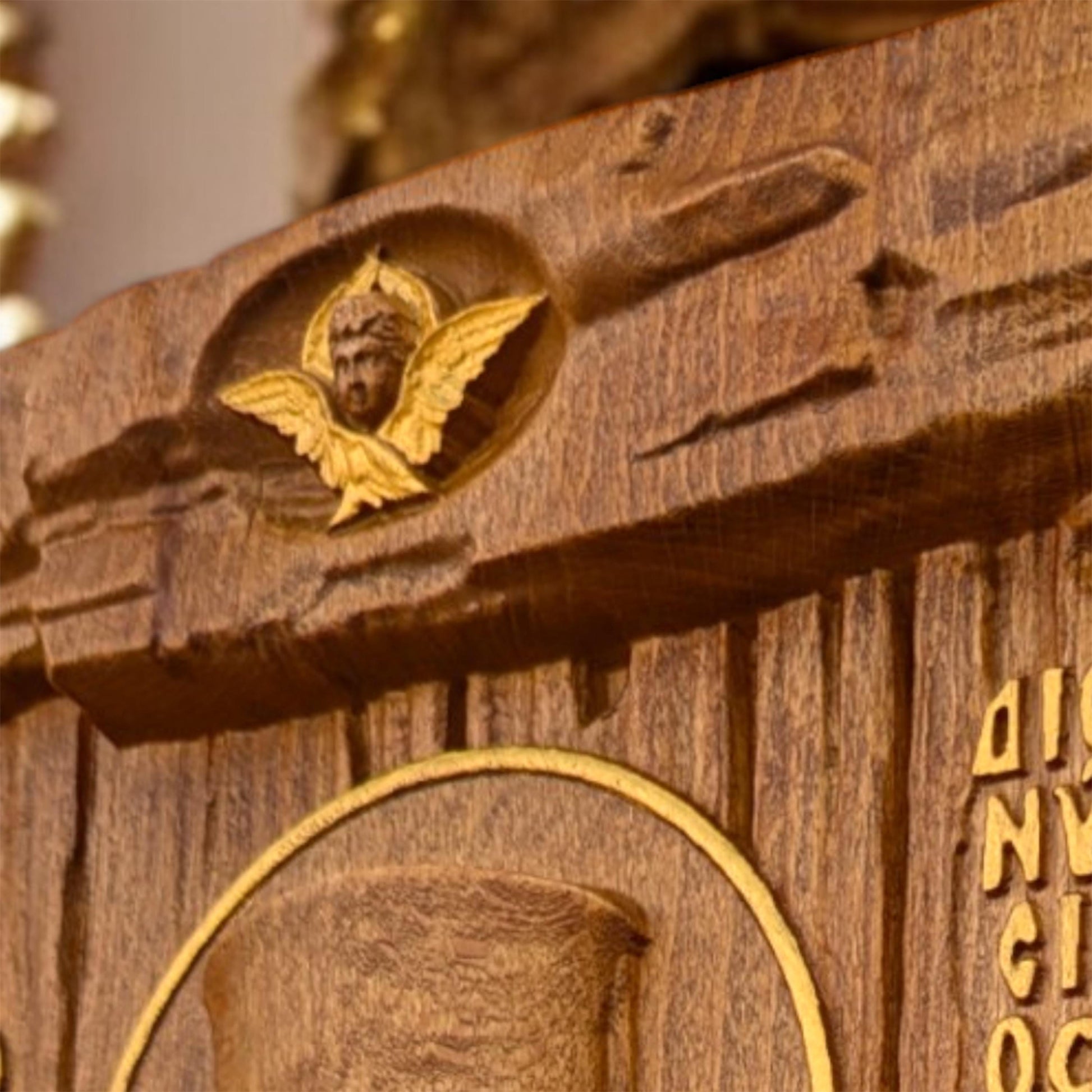 ΔΙΑΔΙΚΑΣΙΑ ΚΑΤΑΣΚΕΥΗΣ Αυτή η Εικόνα είναι κατασκευασμένη από υψηλής ποιότητας φυσικό μασίφ ξύλο φλαμουριάς. Η κατασκευή της περιλαμβάνει την χρήση μηχανημάτων σκαλίσματος ξύλου, με χειροκίνητο συντονισμό και ολοκληρώνεται στο χέρι με φιλικά προς το περιβάλλον χρώματα με βάση το νερό και κερί μέλισσας. Οι χρυσές λεπτομέρειες ζωγραφίζονται στο χέρι, εφόσον το επιλέξετε.