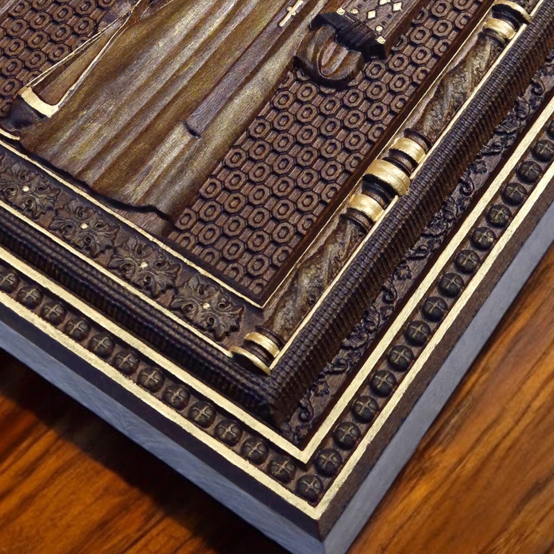 ΔΙΑΔΙΚΑΣΙΑ ΚΑΤΑΣΚΕΥΗΣ Αυτή η Εικόνα είναι κατασκευασμένη από υψηλής ποιότητας φυσικό μασίφ ξύλο φλαμουριάς. Η κατασκευή της περιλαμβάνει την χρήση μηχανημάτων σκαλίσματος ξύλου, με χειροκίνητο συντονισμό και ολοκληρώνεται στο χέρι με φιλικά προς το περιβάλλον χρώματα με βάση το νερό και κερί μέλισσας. Οι χρυσές λεπτομέρειες ζωγραφίζονται στο χέρι, εφόσον το επιλέξετε.